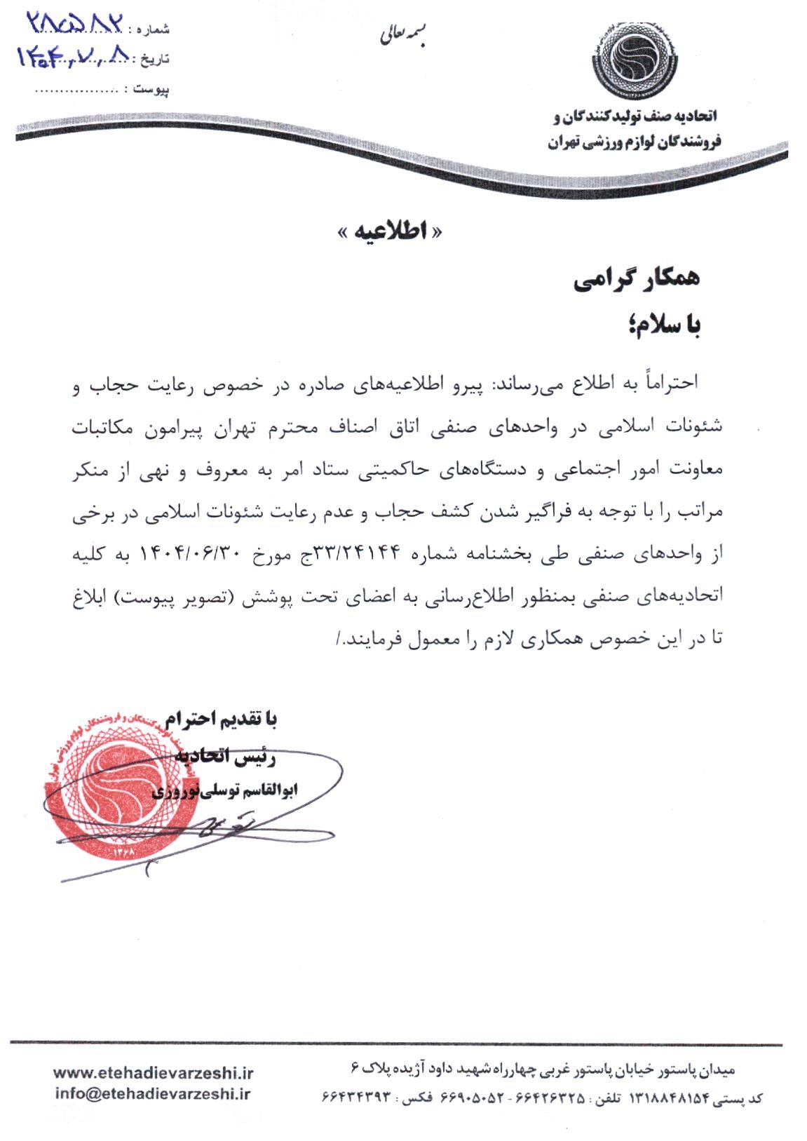 (33)- بخشنامه درخصوص فراگير شدن كشف حجاب و عدم رعايت شئونات اسلامي در برخي از واحدهاي صنفي طي بخشنامه شماره 33/24144 مورخ 140/06/30 به كليه اتحاديه هاي صنفي بمنظور اطلاع رساني به اعضا تحت پوشش