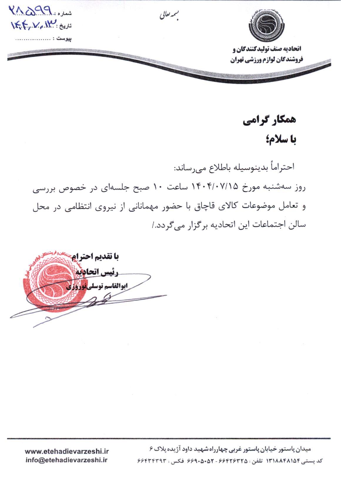 جلسه سه شنبه مورخ 1404/07/15 ساعت 10 در خصوص موضوع كالاي قاچاق با حضور مهماناني از نيروي انتظامي در محل سالن اجتماعات اتحاديه لوازم ورزشي تهران