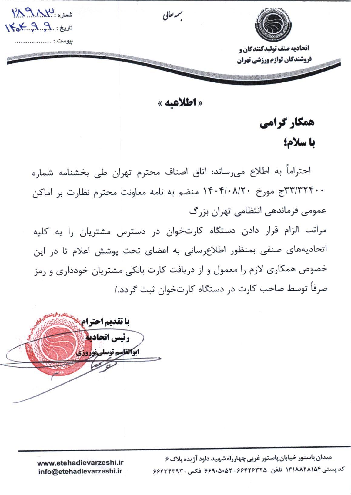 (33) بخشنامه - درخصوص الزام اصناف براي قراردادن دستگاه كارت خوان در دسترس عموم به كليه اتحاديه هاي صنفي بمنظور اطلاع رساني به اعضاي تحت پوشش اعلام