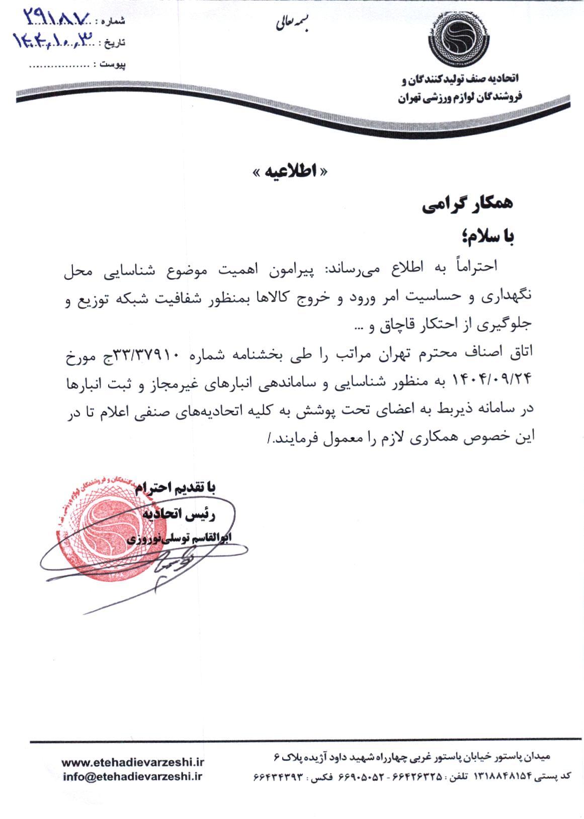 (33)- بخشنامه اتحاديه هاي مرتبط بند 9 مصوبات سيزدهمين جلسه درخصوص شناسايي و ساماندهي انبارهاي غيرمجاز و ثبت انبارها در سامانه ديربط به اعضاي تحت پوشش