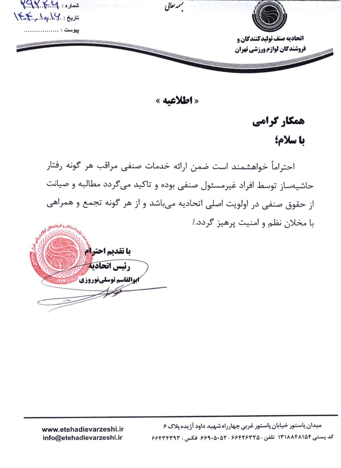 پرهيز از هر گونه تجمع و همراهي با مخلان نظم و امنيت و مراقب هر گونه رفتار حاشيه ساز توسط افراد غير مسئول صنفي بوده و تاكيد مي گردد مطالبه و صيانت